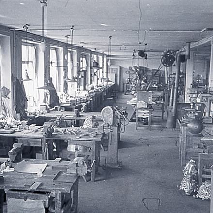 Vieles wurde auch in Serie produziert, Tabernakel, Schalen, Schmuck. "Ein flämischer Leuchter war eine Zeitlang der Renner," erinnert sich der langjährige Werkzeugmacher, der selber viele Arbeitsvorgänge rationalisierte. Er freute sich, dass Jahre später eine alte Friktionsspindelpresse in Regensburg wieder aufgetaucht ist, "eine der guten Erfindungen des Alten Herrn", wie Firmengründer Johann Ludwig Leonhard Brandner bei den Mitarbeitern hieß. In der großen Suite 201 lässt Fridolin Schneider amüsiert seine Blicke schweifen. "Hier saßen der Designer und die Ziseleure, da war ein Arbeitstisch am anderen."